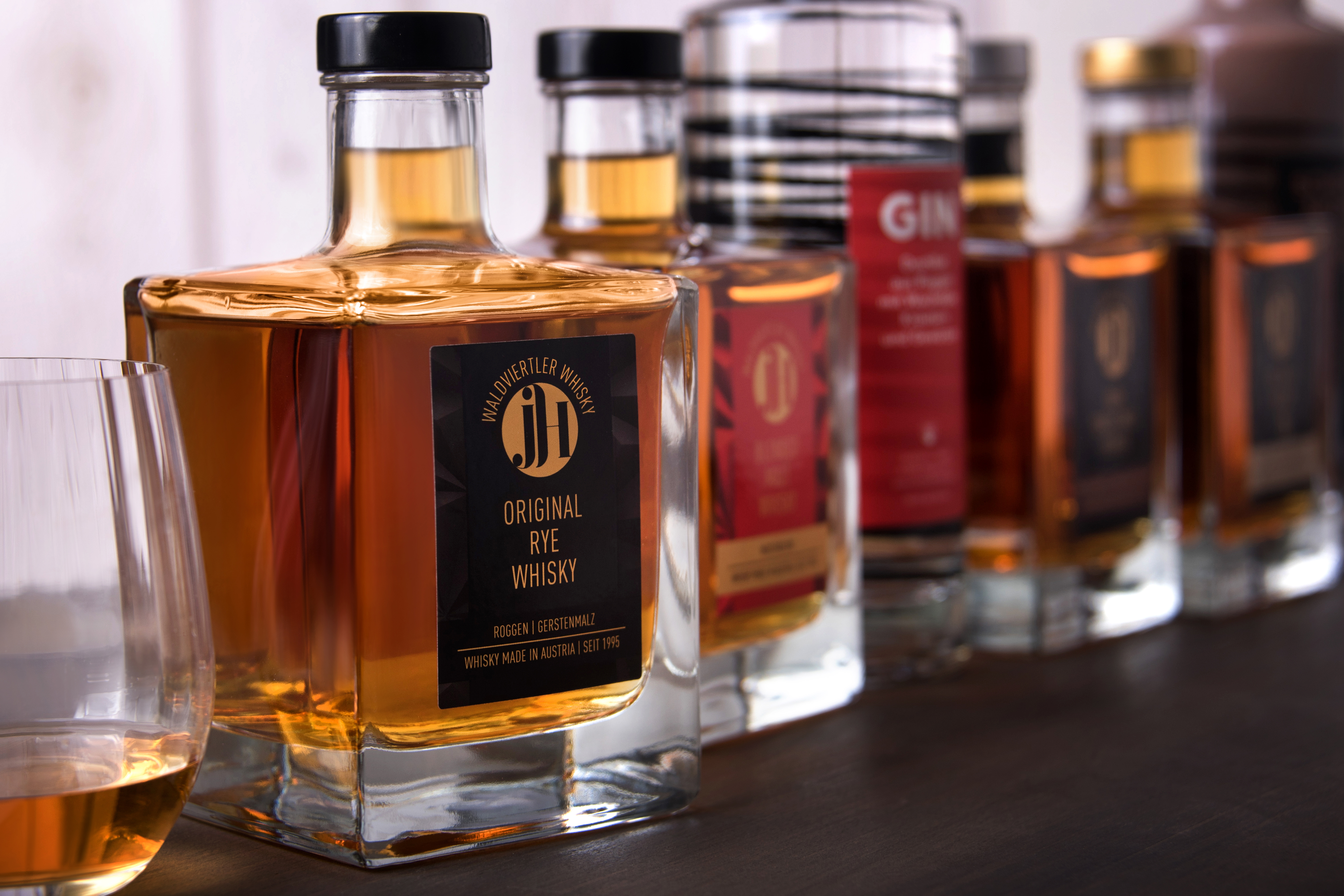 Wellkarton mit: Original Rye Whisky J.H. 0,35l Waldviertler Gin 0,1l Schoko-Mohn Whiskylikör 0,1l